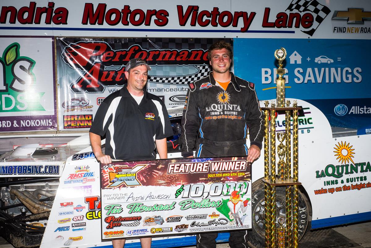 ALEXANDRIA, MN (July 6, 2014) - Fargo, ND driver Austin Arneson held off former Mod Nationals champions Scot Danzeisen and Dale Mathison to win the 10th Annual Minnesota Modified Nationals Championship presented by Performance Auto on a beautiful Sunday evening. In doing so, Arneson picked up the biggest win of his young career and the largest Modified payout in WISSOTA history, $10,001.