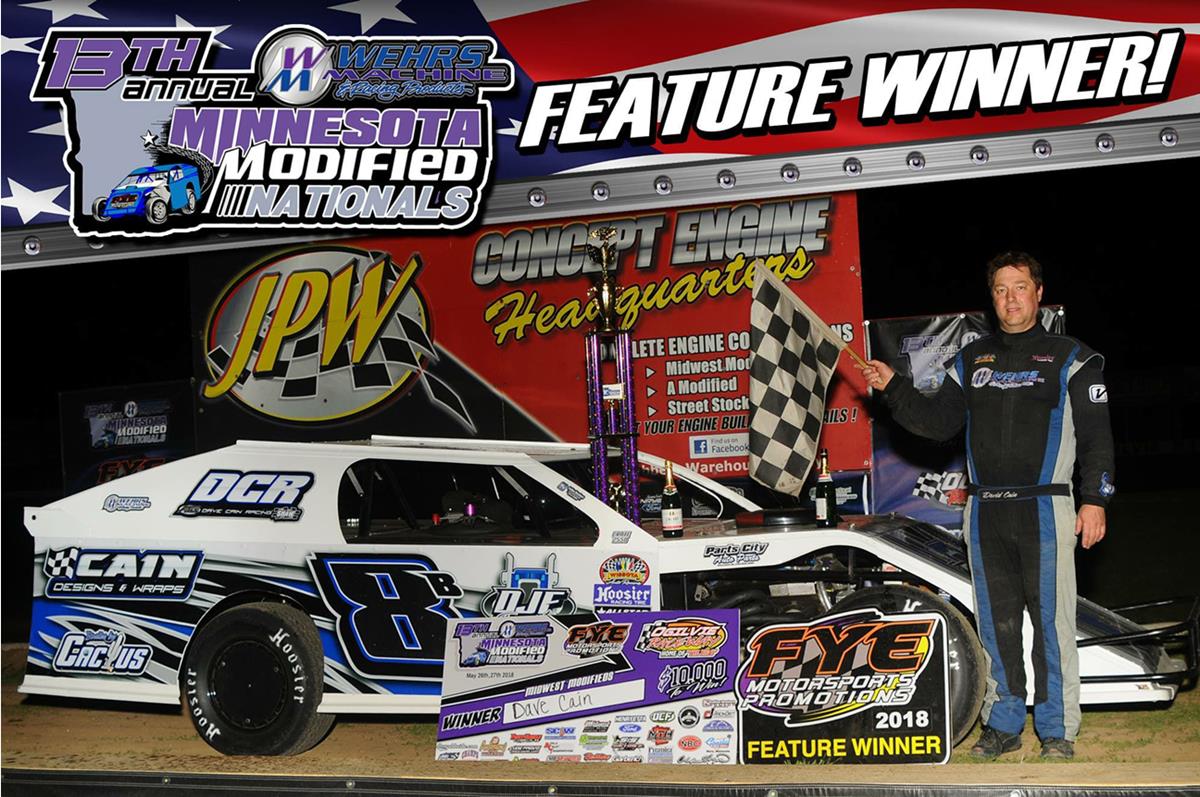 Wehrs Machine & Racing Products Wissota Midwest Mod. Feature (50 Laps): 1. 8B-Dave Cain, 19:53.691[3]; 2. EZ1-Shane Sabraski, 20:07.787[17]; 3. QQ-Tony Bahr, 01:49.962[2]; 4. 24JR-Jeffrey Lien Jr., 20:11.526[8]; 5. 06-Jeremy Nelson, 20:11.905[20]; 6. 7R-Tommy Richards, 20:13.711[4]; 7. 20-Austin Ellis, 19:54.814[7]; 8. 85-Jamie Davis, 19:59.835[6]; 9. 13-Nick Koehler, 20:00.253[18]; 10. 7-Brandon Mehrwerth, 20:00.809[5]; 11. 37X-Skeeter Estey, 20:01.186[25]; 12. 12-Justin A-Strike, 01:49.962[14]; 13. 16-Jason VandeKamp, 20:02.070[23]; 14. 23D-Kevin Adams, 20:02.413[24]; 15. 7J-Corey Jones, 20:03.945[10]; 16. 37K-Kelly Estey, 01:49.962[16]; 17. 42X-Travis Saurer, 01:49.962[22]; 18. 50C-Cody Lee, 20:06.832[11]; 19. 16S-Ryan Savoy, 20:07.050[28]; 20. 15-Wade Skindelien, 20:07.511[27]; 21. (DNF) 10-Mack Estey, 11:41.129[9]; 22. (DNF) 1JR-Tim Johnson, 01:49.962[15]; 23. (DNF) 67-Mike Nichols, 10:21.017[21]; 24. (DNF) 45JR-Loren Inman, 01:49.962[26]; 25. (DNF) 221-Aric Lindberg, 09:24.280[12]; 26. (DNF) 18A-Landon Atkinson, 07:56.139[19]; 27. (DNF) 71-Dustin Strand, 01:49.962[13]; (DQ) 33X-Justin Froemming, 20:07.255[1]