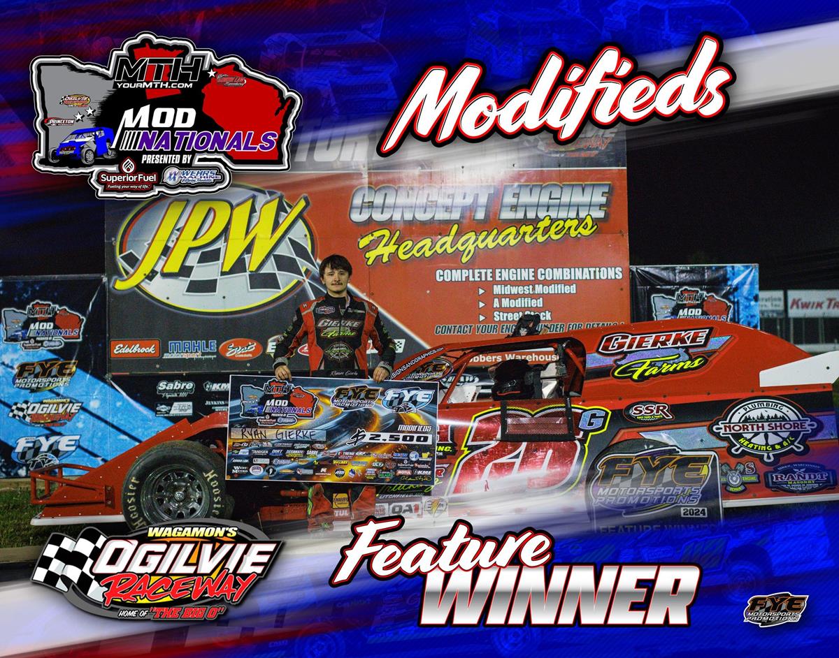 Ogilvie, MN (May 26) – Sunday night’s race program at Wagamon’s Ogilvie Raceway wrapped up the 2024 FYE Motorsports Minnesota Truck Headquarters Modified Nationals powered by Wehrs Machine and Superior Fuel. 103 drivers signed in for the night of WISSOTA Dirt Track Race Action and put on an incredible night of door-to-door racing, and at the end of the night, Jake Smith, Dexton Koch, Ryan Gierke, Dustin Holtquist and Payson Patrin claimed the hardware.