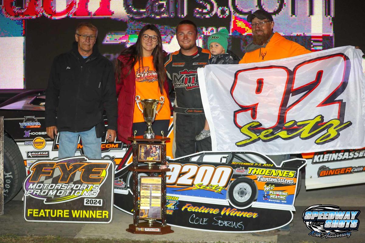 Cole Searing of Huron, South Dakota won the night’s 92-lap, $9,200-to-win Seitz Memorial Late Model finale. The race was paced early by Go Hard or Go Home pole dash winner Chad Becker for the first 13 laps. On lap 14, two-time Seitz Memorial champion Aaron Turnbull took the point, wheeling a car owned by Shane Edginton, and brought Searing with him.